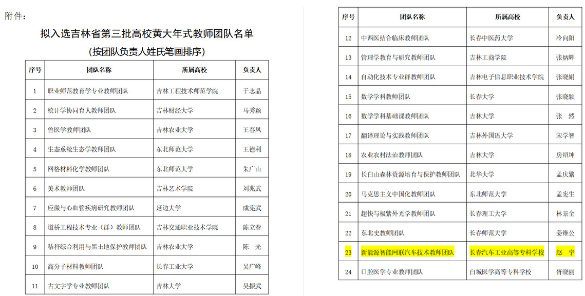 近日,吉林省教育厅公布了“吉林省第三批高校黄大年式教师团队”认定名单,我校二级教授、汽车运用学院院长赵宇领衔的新能源智能网联汽车技术教师团队成功入选。